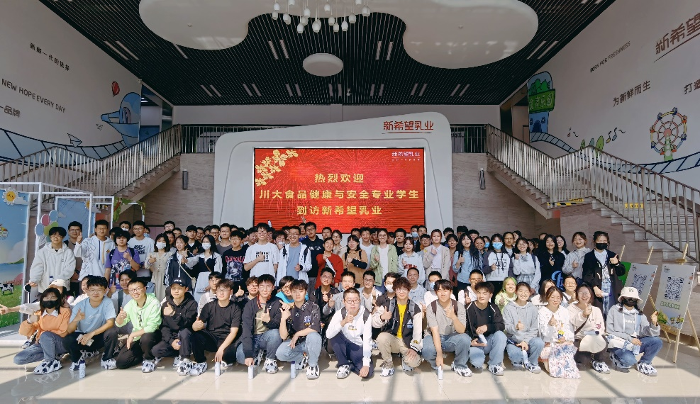 本次“轻访学”第二站是位于郫都区的新希望乳业有限公司。新希望乳业隶属于新希望集团,新希望集团是中国农业产业化国家级重点龙头企业。公司两位讲解老师首先为同学们先后介绍了新希望集团的历史、农牧与食品、化工与资源、地产与基础设施、金融与投资四大产业集群。随后,两位讲解老师带领同学们参观了新希望研发中心和干净整洁的园区,错综复杂的乳品输送管道映入眼帘,通过老师们系统全面的讲解,同学们了解到新希望乳制品产业发展历程以及乳制品加工技术。最后,四川新希望乳业有限公司张宗元副总经理与同学们进行了面对面交流,鼓励同学们认真学习专业知识,并欢迎同学们毕业后为加入新希望团队。