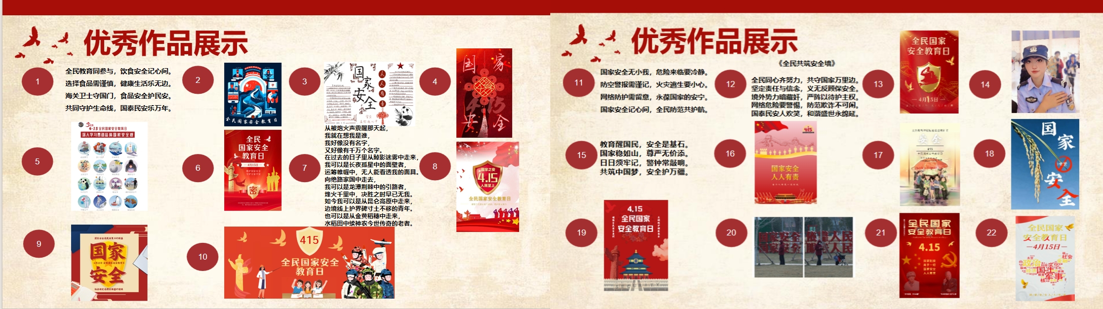 紧接着,党支部开展了“国家安全,青春挺膺”创意作品展示,同志们以海报、诗集、散文、摄影作品等不同形式表达了自身对维护国家安全的意义和重要性的理解,同志们相互交流创作灵感和作品内涵,加强了对国家安全的精神实质的领悟。