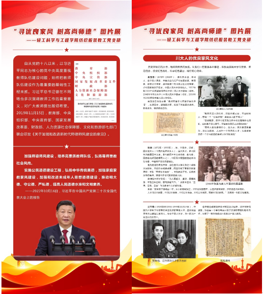为深入学习贯彻党的二十大精神,加强师德师风建设,激励广大教师牢记立德树人使命,122日下午,纺织服装教工党支部在纺工楼一楼大厅组织开展了寻优良家风树高尚师德图片展主题活动