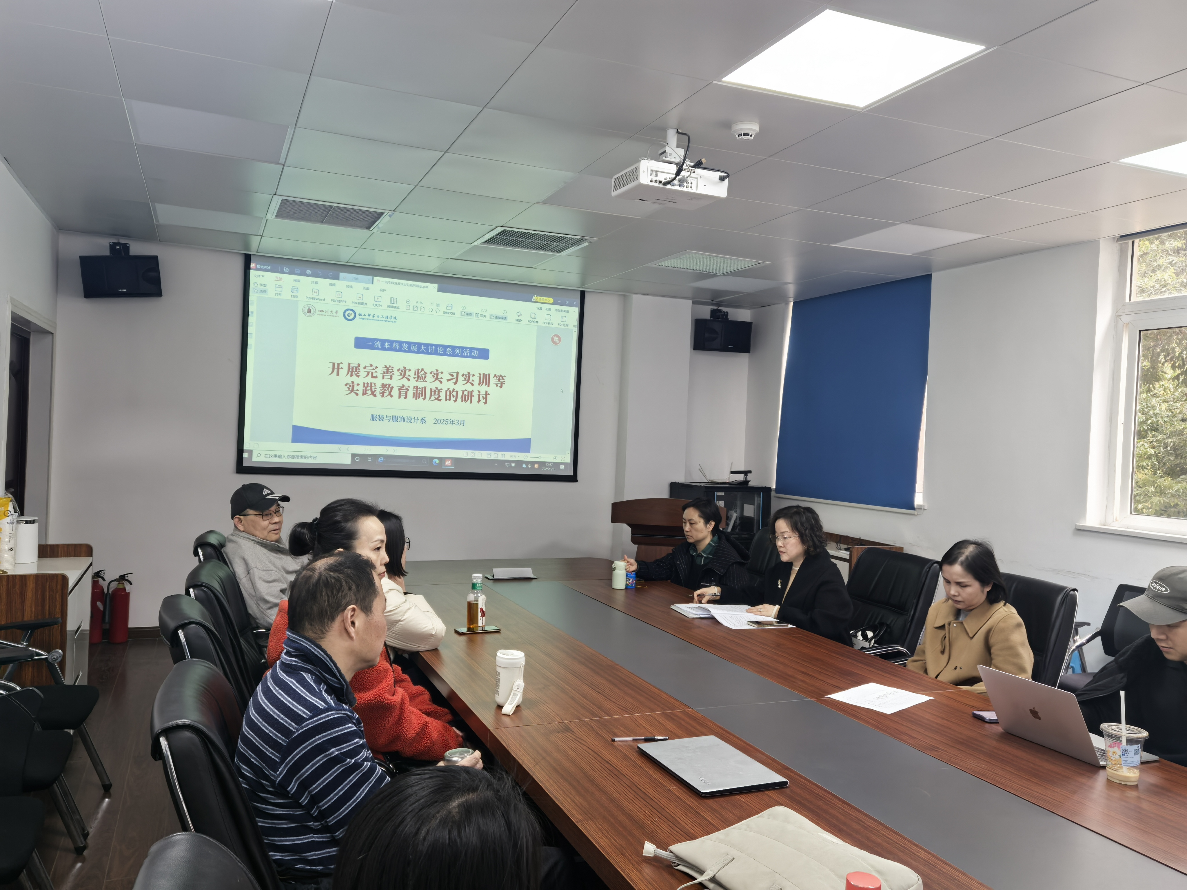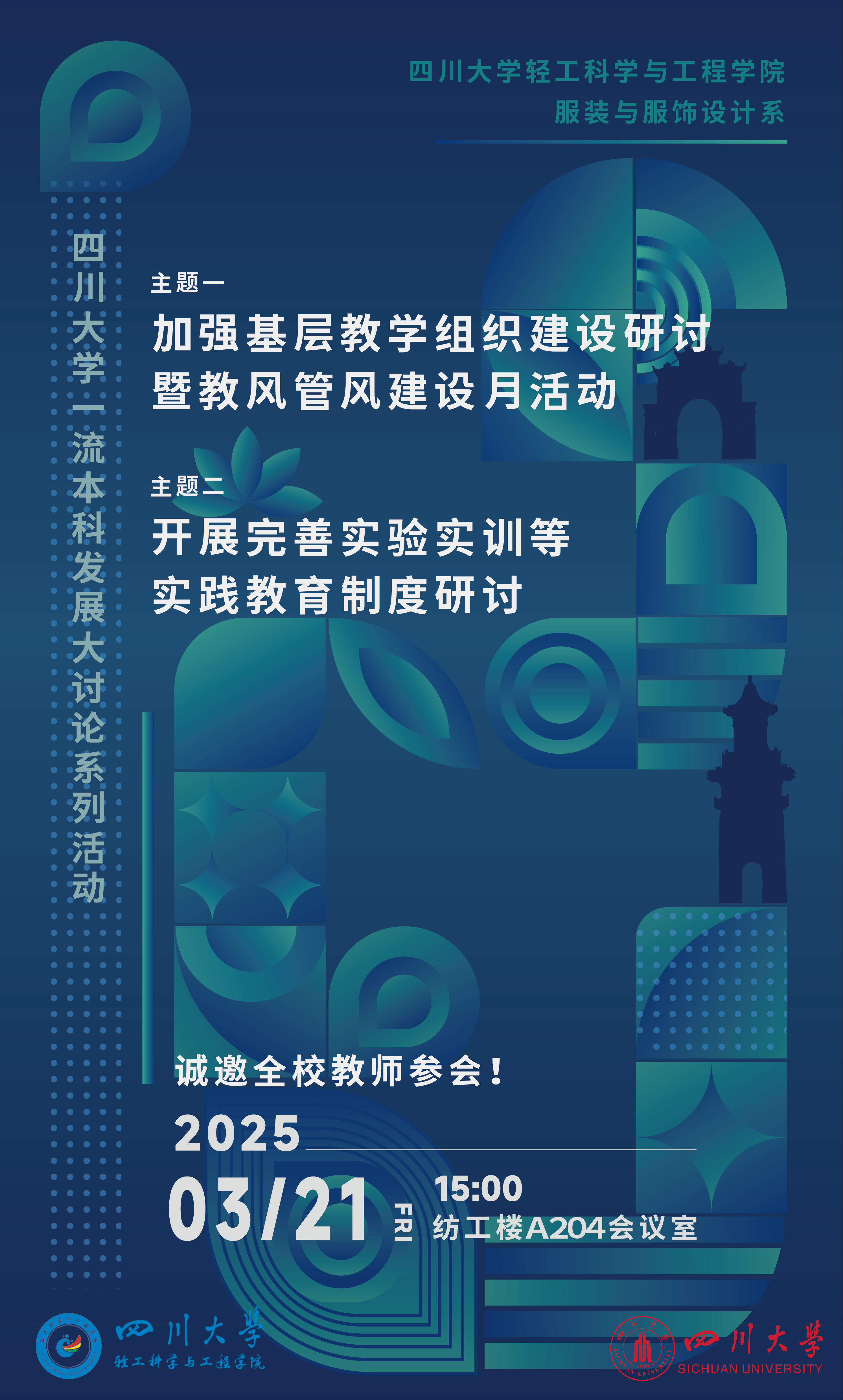 为全面贯彻习近平总书记关于教育工作的重要论述,锚定2035年教育强国建设目标,共同答好“教育强国,川大何为,一流本科何为”的重要命题, 2025年3月21日下午,服装与服饰设计系在纺工楼A204会议室组织全体教师,围绕“加强基层教学组织建设研讨暨教风管风建设月”、“完善实验实习实训等实践教育制度”两大主题展开了研讨。本次研讨邀请到经理彭必雨参会,会议由副系主任申鸿主持。